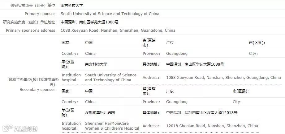 贺建奎在中国临床试验注册中心提交的申请资料显示,除了项目的医学伦理批准委员会为深圳和美妇儿科医院伦理委员会, 该项目的研究实验地点是深圳和美妇儿科医院。
