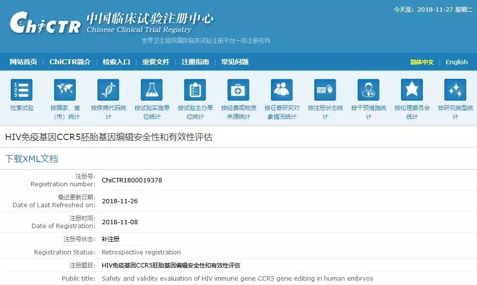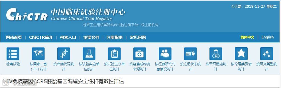 为了了解“基因编辑婴儿”事件始末,双语君(微信ID:Chinadaily_Mobile)在中国临床试验注册中心官方平台上,找到了贺建奎注册题目为《疫基因CCR5胚胎基因编辑安全性和有效性评估》的试验。