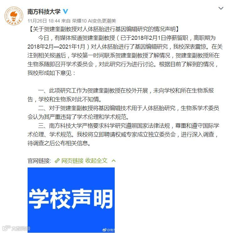 南方科技大学表示,学校对该研究不知情,贺建奎并未向学校报告。