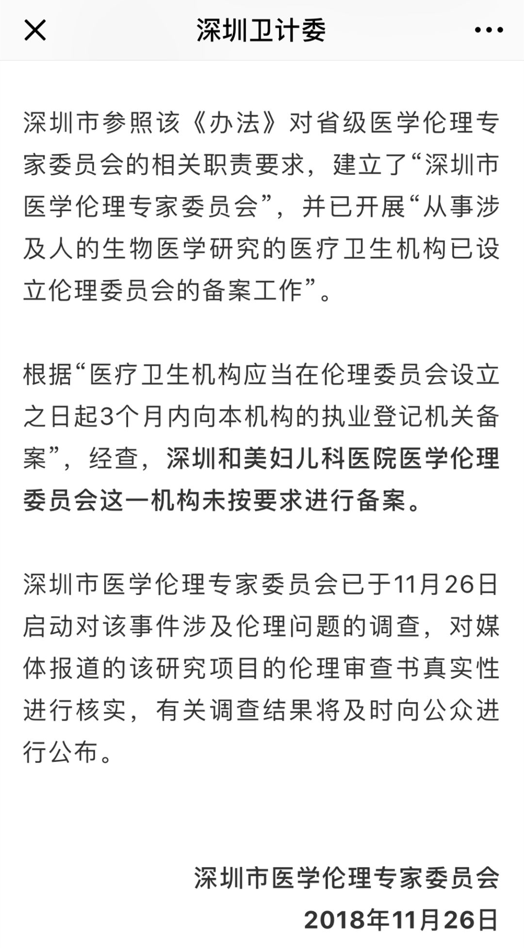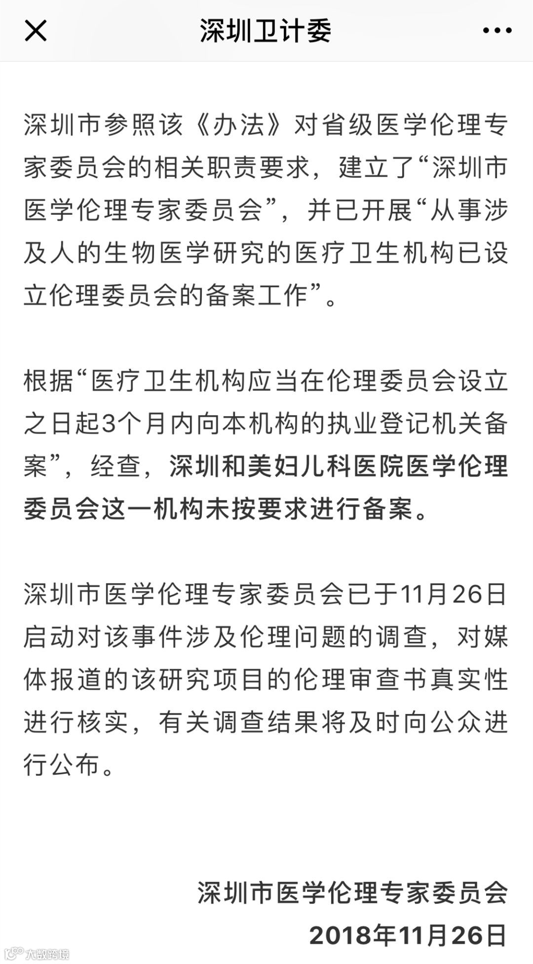 26日晚,针对“基因编辑婴儿”事件,深圳市卫计委发布声明表示已对该事件展开调查。