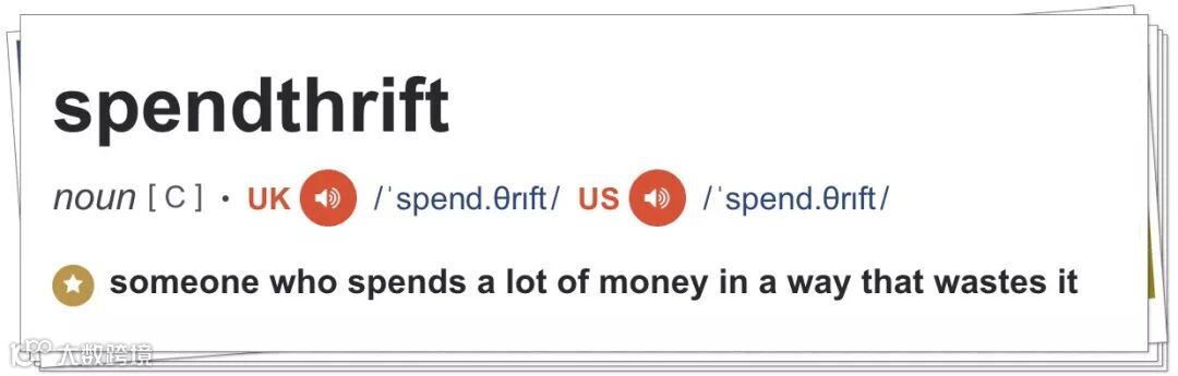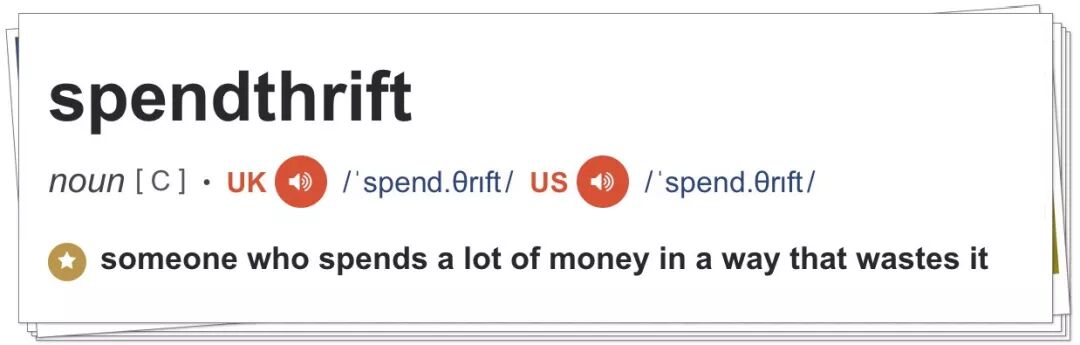 从牛津词典中,我们清楚地看到,spendthrift表示“一个挥霍无度的人”,略带贬义,大家谨慎使用哦!当然,如果配合一定的语境和语气,也能产生萌萌的感觉。