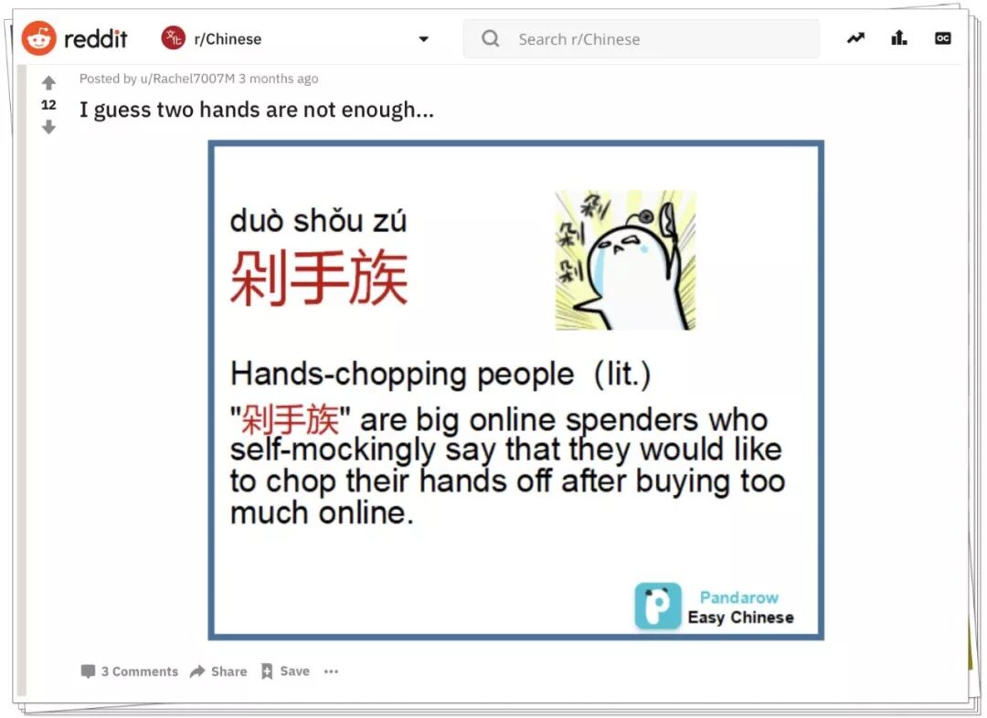 不过,随着中国国际地位的上升,很多中国文化也随着互联网传播到国外,我就在一个国外影响力很大的论坛“reddit”上看到过有人发了一张图片“剁手党”的英文解释。一起看一下: