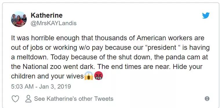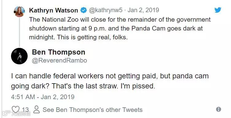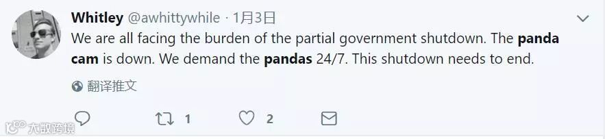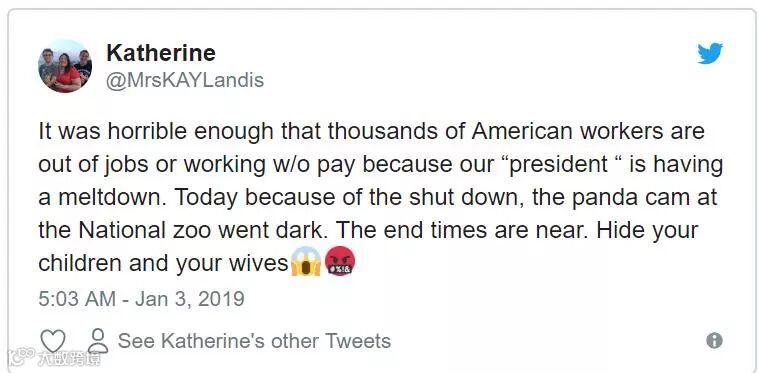 因为我们的政府停摆,很多美国工人暂停了工作或者被停薪,这已经足够糟糕了。今天因为停摆,又导致了熊猫网络直播被关,末日要到了,藏好你们的孩子和妻子。