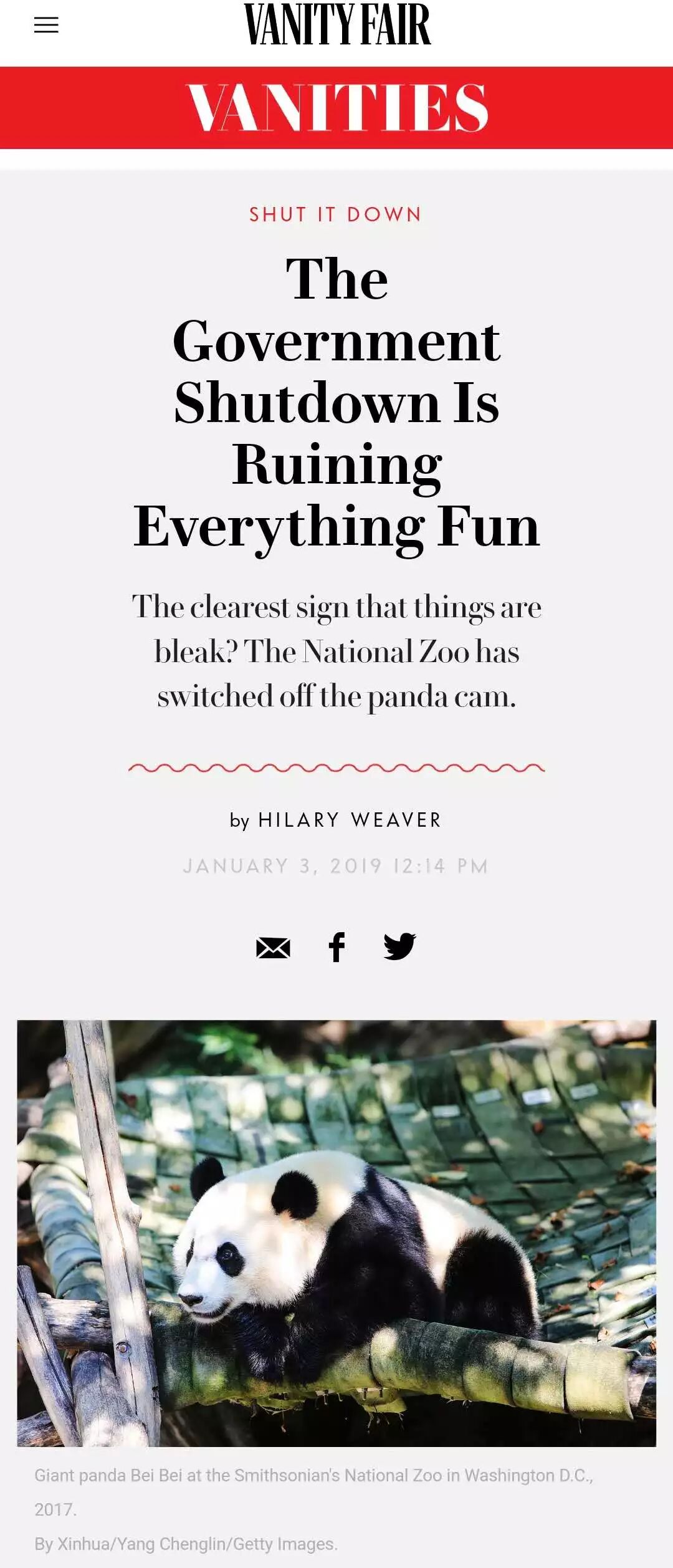 《名利场》在报道的标题里表示,政府关门正在破坏一切有趣的东西!这难道是事情变得更加暗淡的最明显标志?史密森尼国家动物园关闭了熊猫网络直播。