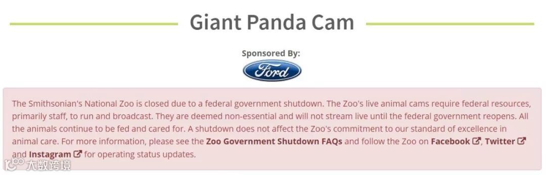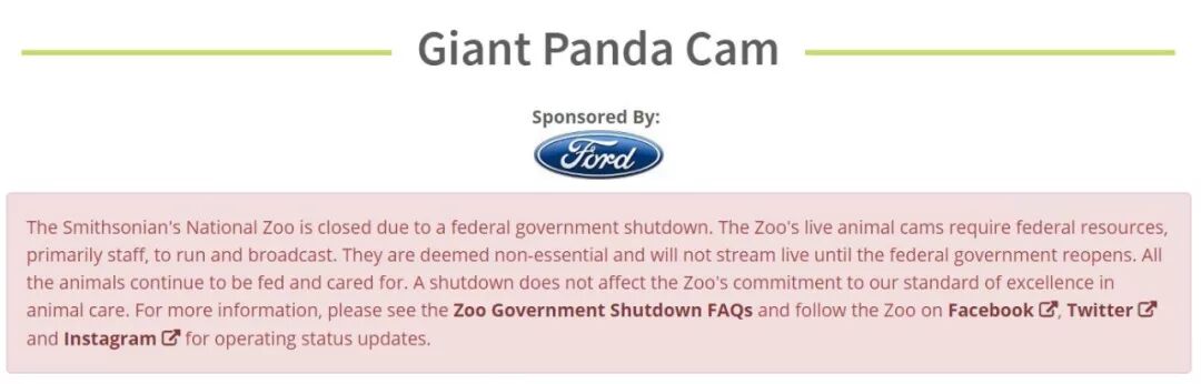因为联邦政府的关闭,史密森尼国家动物园被迫关闭。维持园内的动物网络直播都离不开联邦政府资源和人员的支持,我们认为“网络直播”不是不可或缺的服务,因此在联邦政府重启之前我们将停止直播。然而,我们不会因此而改变我们继续以高标准悉心照顾动物的承诺。
