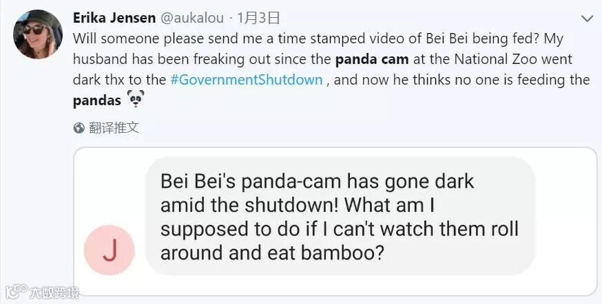 有人能给我一个贝贝进食的视频吗?自从史密森尼国家动物园关闭了熊猫直播,我老公已经要疯了,现在他认为他的熊猫宝宝正在挨饿。因为政府关门导致熊猫贝贝的直播被关,天啊,如果看不到他们滚来滚去和吃竹子,我该怎么办!