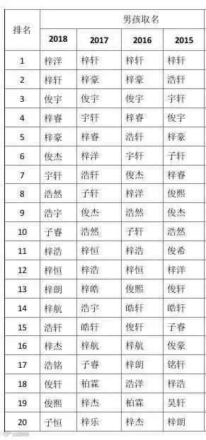 第2名为“梓轩”,而这个名字曾经两年高居榜首。第3-10名分别为俊宇、梓睿、梓豪、俊杰、宇轩、浩然、浩宇、子睿。