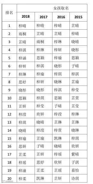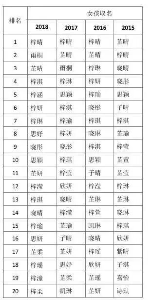 女孩取名最多的是“梓晴”,已经连续3年高居榜首,约1000个新生女孩中有2人。而2-10名分别是雨桐、芷晴、梓淇、梓涵、梓妍、梓琳、思妤、晓彤、思颖。