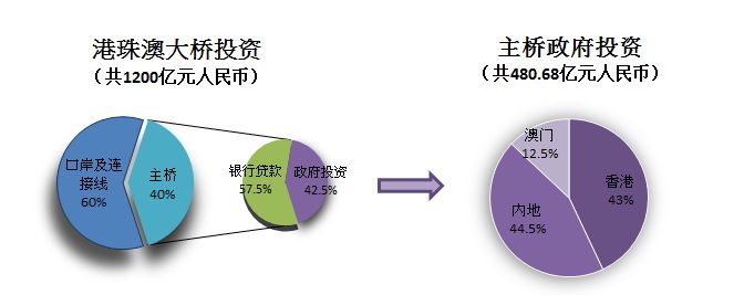 主桥的480.68亿元投资里,57.5%为银行贷款,会由大桥未来30年的通行费偿还;剩下42.5%为政府投资,其中香港特区政府占43%,广东省政府和中央政府占44.5%,澳门特区政府占12.5%。这一比例是三方政府根据大桥建成后各自可获得的经济效益占比拟定的。