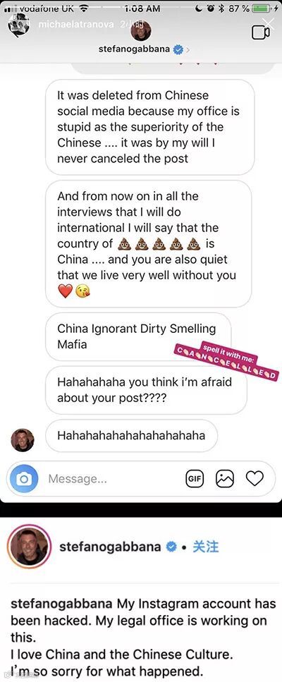 Early Wednesday morning, in a chat on Instagram between a netizen named "michaelatranova" and someone using the personal account of Gabbana, the latter appeared to make insulting references toward China and Chinese people.