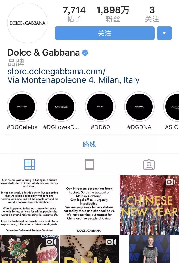 Dolce & Gabbana posted an announcement on its Weibo account saying: "Our Instagram account has been hacked. So has the account of Stefano Gabbana. Our legal office is urgently investigating. We are sorry for any distress caused by these unauthorized posts. We have nothing but respect for China and the people of China."