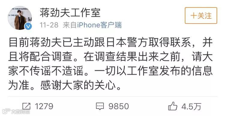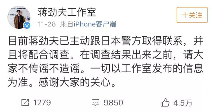 28日下午,蒋劲夫工作室曾发文,表示蒋劲夫已经主动与日本警方取得联系,并且将配合调查。