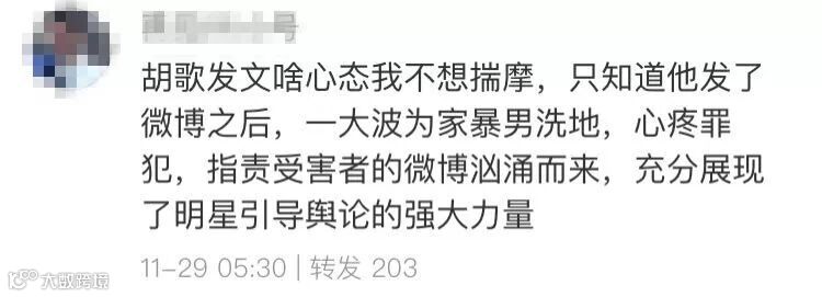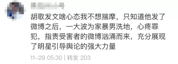 还有网友观察到,这一事件反映出公众对于“家暴”的容忍度很高,有人会为施暴者找理由,责备受害者,还有人觉得“一个巴掌拍不响”,这只是两口子之间的私事。