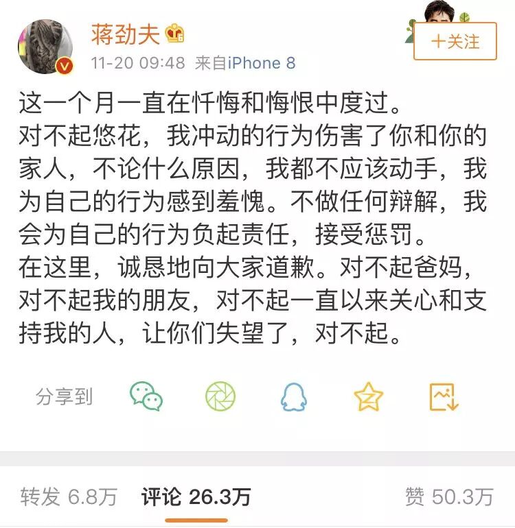 随后,蒋劲夫承认家暴,并向女友道歉。