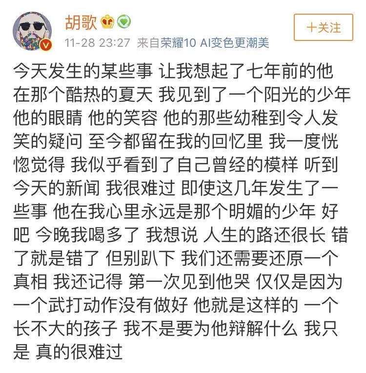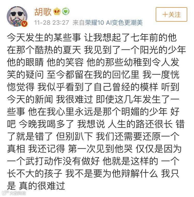 28日凌晨,胡歌发文疑似表示替蒋劲夫感到惋惜和难过:“人生的路还很长,错了就是错了,但别趴下。我们还需要还原一个真相。”