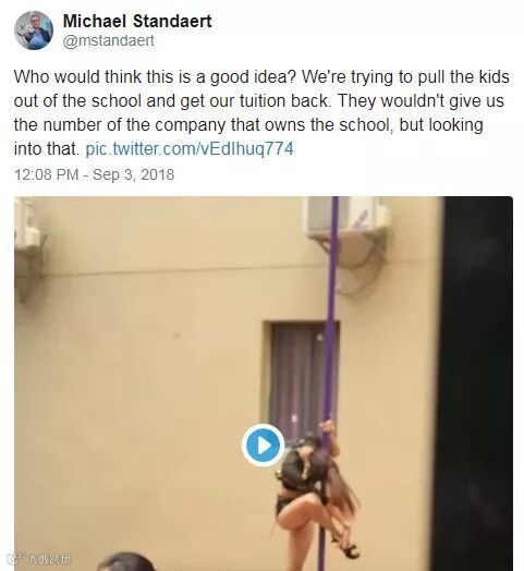 他在推特中贴出了幼儿园中钢管舞的视频,并配文道:“我们要让孩子退学,要回学费”。