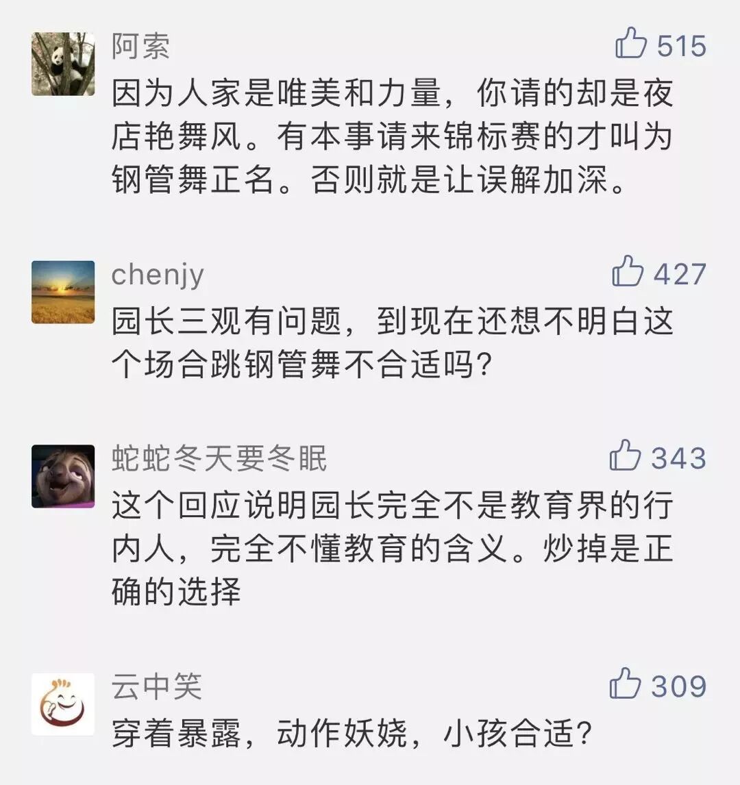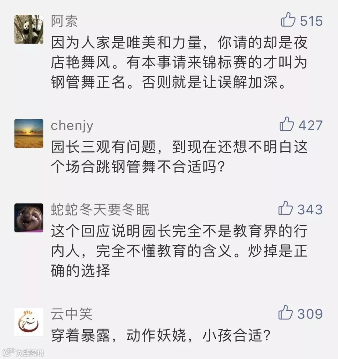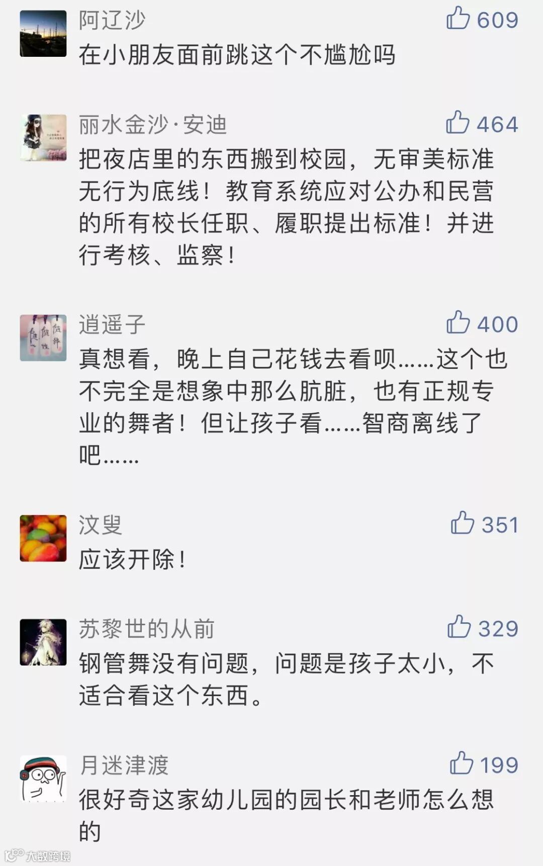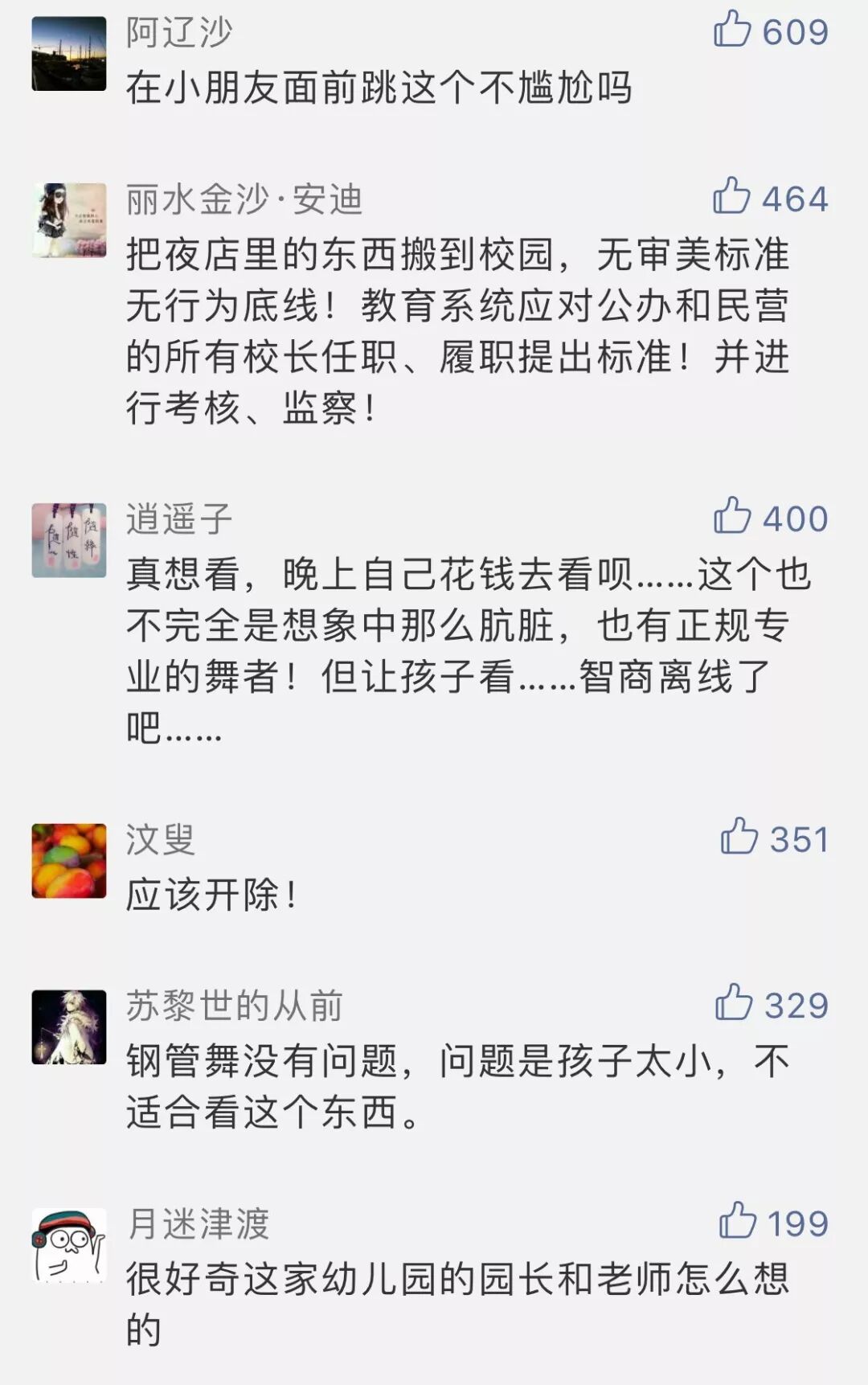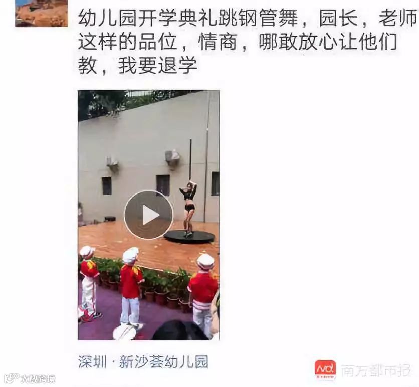 有家长在朋友圈吐槽,“幼儿园开学典礼跳钢管舞,园长老师这样的品味,情商,哪敢放心让他们教,我要退学”。