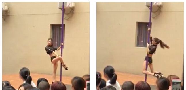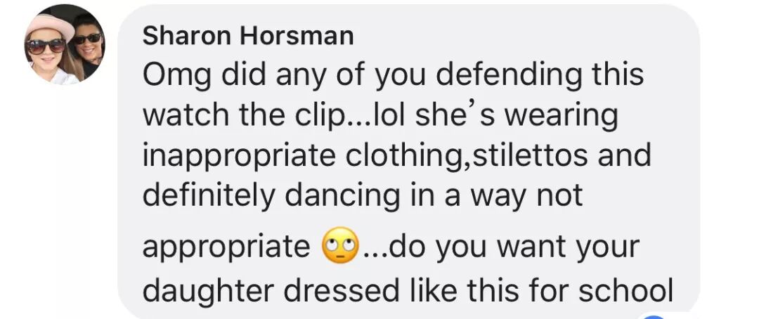 天哪,你们挺钢管舞的人究竟有没有看视频啊……她穿着不合时宜的衣服,细高跟,跳的舞也完全不合适……你们也想让自己女儿穿成这样上学吗?