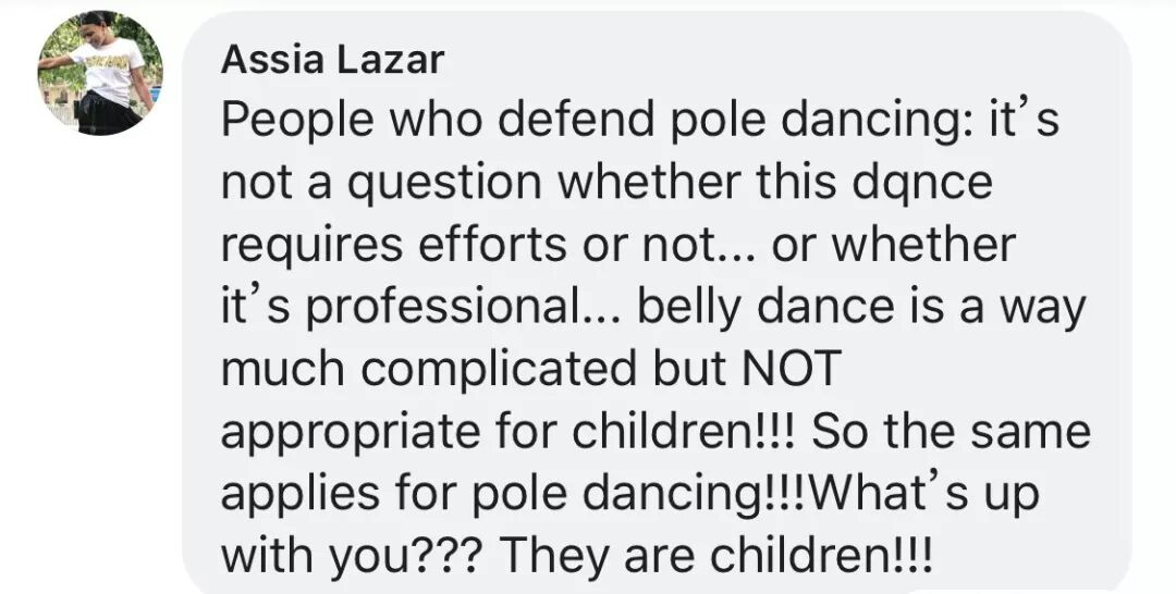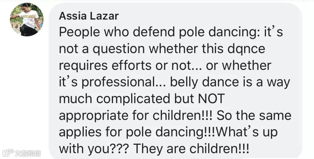 力挺钢管舞的人:现在问题关键不是钢管舞是不是有技术含量,或者是不是专业。肚皮舞也很难学,但是这对孩子不合适啊!!!所以说这对钢管舞也一样。有毛病吗?他们是孩子啊!!!