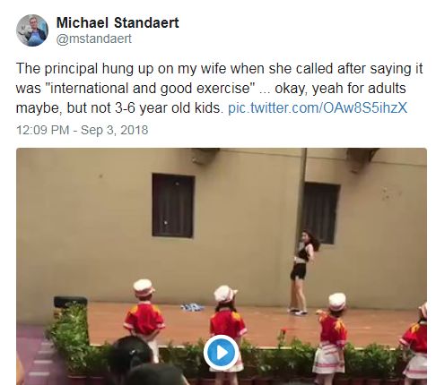 而司马天表示,在他妻子打电话给幼儿园园长时,园长说,“这是一项国际化的,很好的健身运动”。之后,电话被对方挂断。