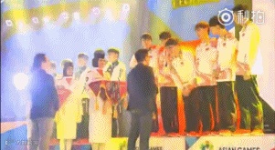 颁奖仪式上,亚洲电子体育联合会主席霍启刚为选手们带上了象征着胜利和荣誉的金牌。