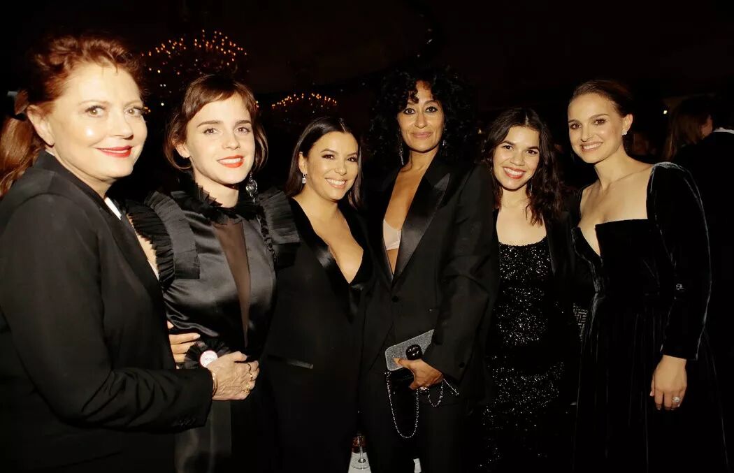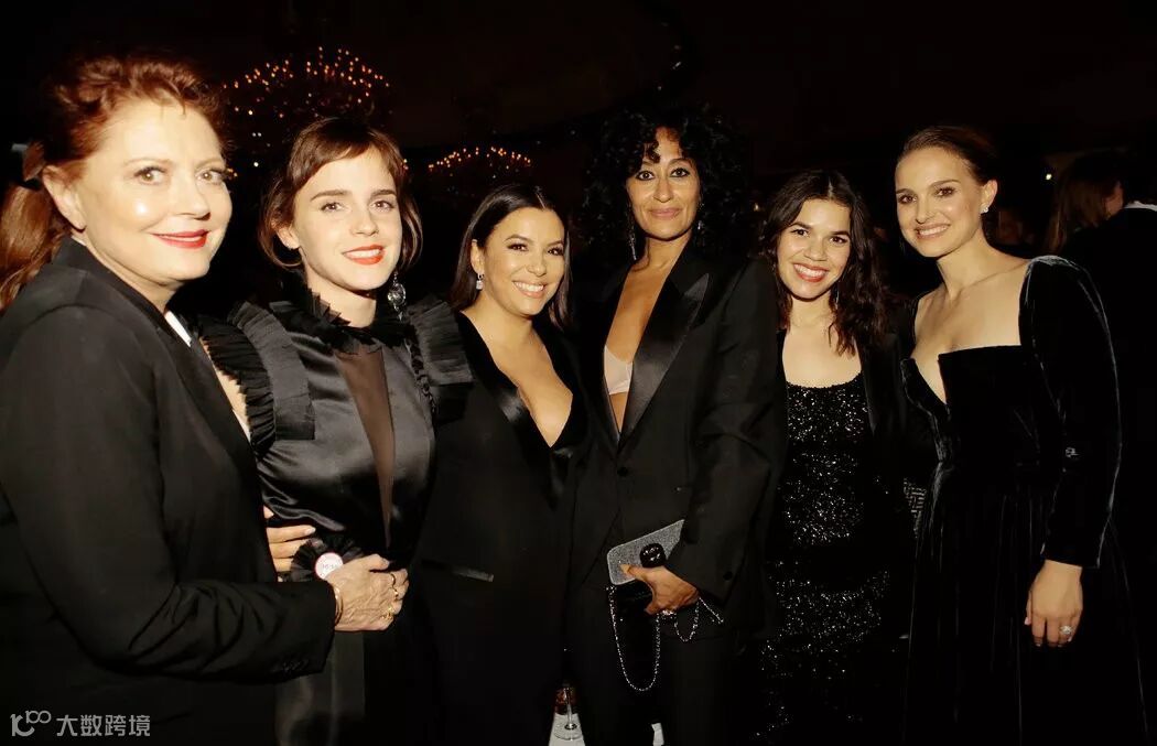 金球奖颁奖礼上身穿黑裙的女星,左起:苏珊·萨兰登、艾玛·沃森、伊娃·朗格里亚、特蕾西·埃利斯·罗斯、艾美利卡·弗利拉 图片来源:《纽约时报》