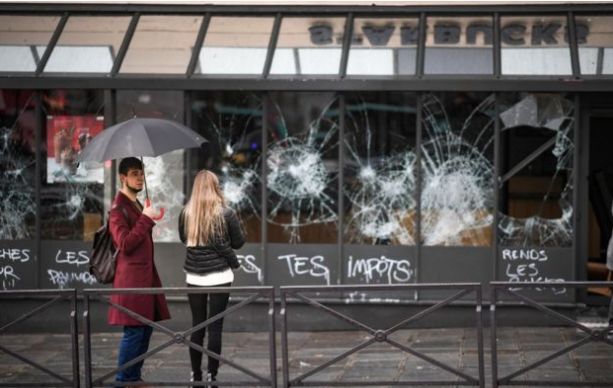 巴黎的一家星巴克在第四次“黄背心”抗议中,橱窗遭到毁坏