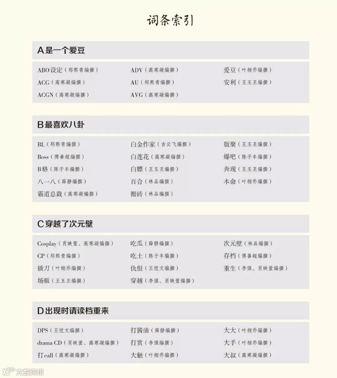 本书一共有245个网络文化关键词,分为6大门类:二次元、同人、女性向、网络文学、游戏、社会流行词。