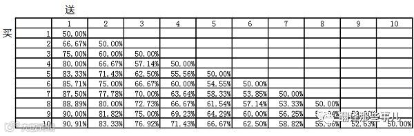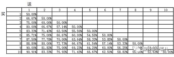 不难归纳出,在A相同时,B越多,折扣就越大。常见到商品促销广告“买3送1,买5送2 ,买10送5”,那么,实际折扣率(discount rate)分别是75%、71.43%、66.67%。