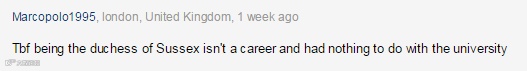 她现在的位置并不是因为自己的学位而得到的,所以他们真的搞错了。如果她的名声是因为学问得到的,或者因为她是演员、电视人物而知名,那样就说得通了。成为一名公爵夫人或者人道主义者,并不需要西北大学的学历。普通人也并不会把成为公爵夫人或者人道主义者当成理想。任何人不去学校都能成为公爵夫人或者人道主义者。如果你真的想要成为公爵夫人,你不需要学位证书,你需要的仅仅是遇到一个对的人。