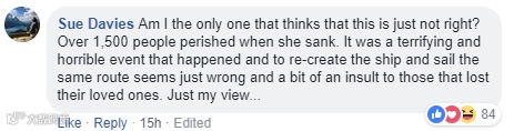 “只有我一个人认为这件事(复制泰坦尼克号)不对吗?1500多人在沉船中丧生,多么骇人听闻的事件。复制泰坦尼克号、走原先的航线是个错误,是对那些(在沉船事件中)失去亲人的人的不敬。仅代表个人观点。”