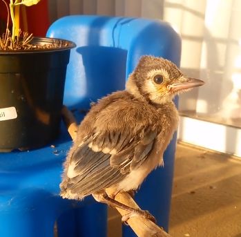 Dina在自家花园的一棵树旁发现了一只刚出生不久的小鸟。它是从树上的巢中摔下来的。