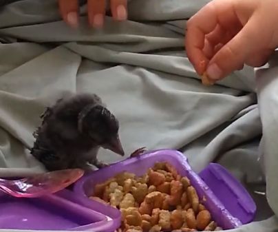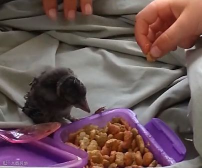 Dina特地请教了动物专家如何喂养幼鸟。她和丈夫,还有女儿将食物切碎浸湿,每三十分钟就轮流给它喂食。