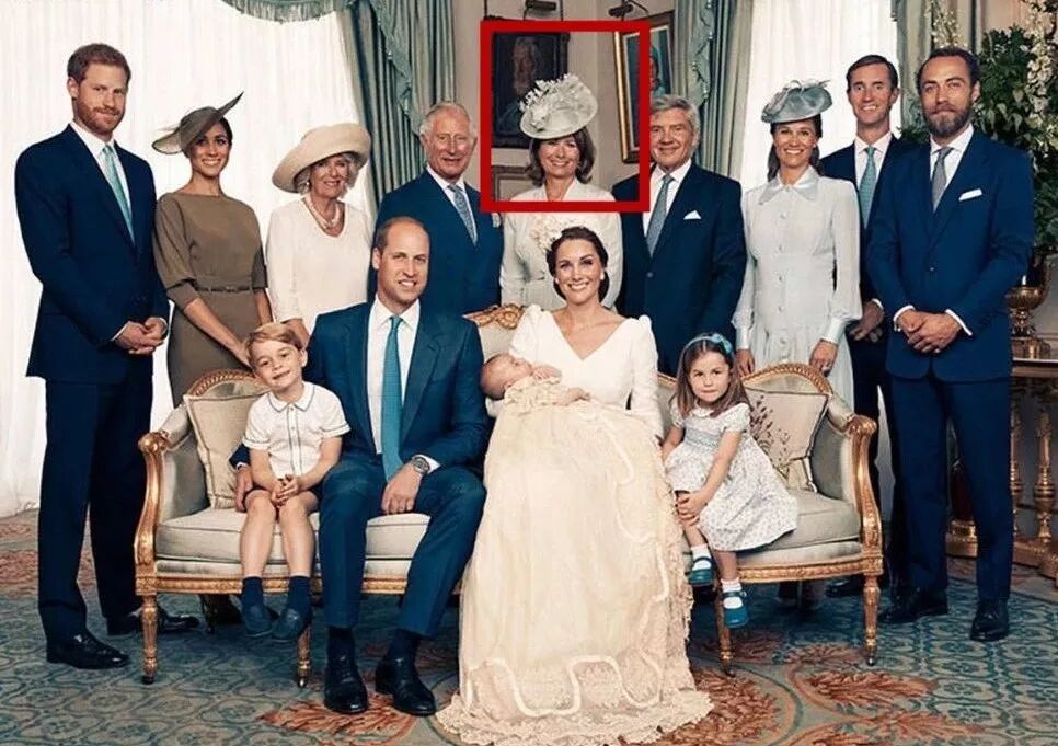 路易小王子在他母亲的膝上安睡,乔治小王子、威廉王子和夏洛特公主坐在两旁,人们的目光立即被吸引到凯特王妃的母亲卡罗尔·米德尔顿身上。她骄傲地站在女儿身后,她的左边是69岁的丈夫迈克尔。