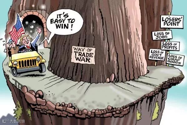 美国总统特朗普一边高喊“打赢很容易!”,一边开车驶向“贸易战之路”,路的尽头是失败者之地:失业、亏损、政府税收损失和低价商品减少。(美国卡格尔漫画网)