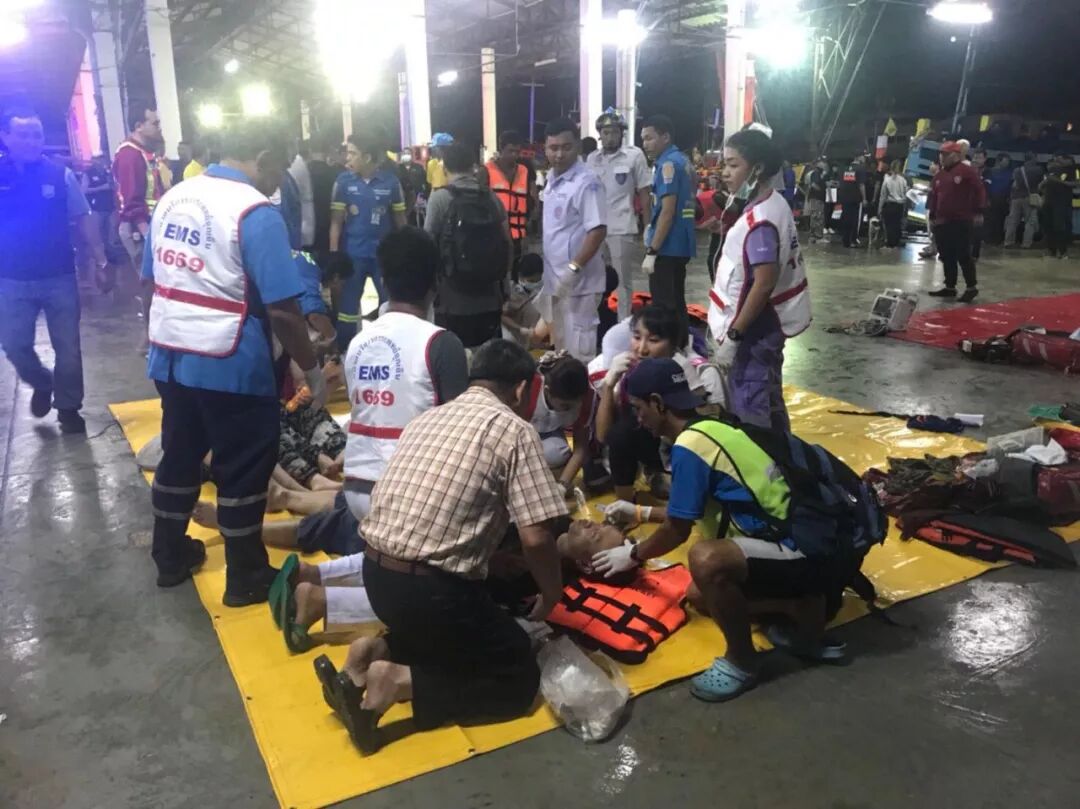 目前有将近80名游客获救,其中11名游客需要留院治疗,一名游客溺亡。留院的游客中,有5名需要动手术,目前没有生命危险。失踪的40多名游客,我们还在继续敦促泰方加紧搜救。