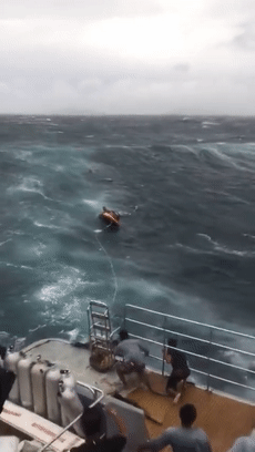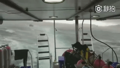 一条小船在风浪中等待救援。来源:@休睇GY