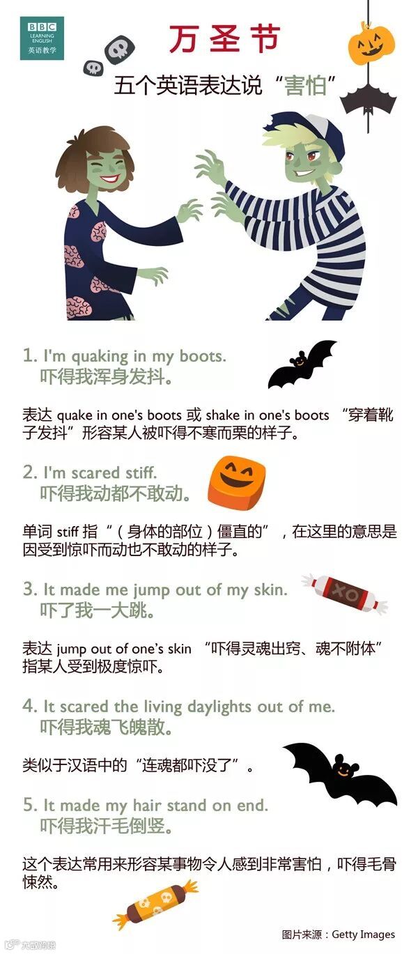 在英国,人们在万圣节期间会举办各种派对,参加派对的人通常会装扮成吓人的鬼怪,以增加节日气氛。如果遇到吓人的妖魔鬼怪,怎样说 “害怕”?