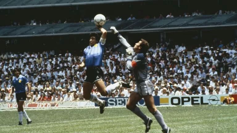 1986在墨西哥世界杯四分之一决赛阿根廷对英格兰的比赛上,时任阿根廷队队长的马拉多纳用手把球攻入了英格兰队的球门,并且裁判判决进球有效。