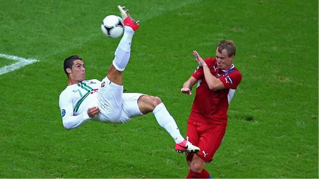 倒挂金钩在英文中有个特别有意思的名字,叫“bicycle kick”(自行车踢),因为人腾起的姿势有点像在半空中蹬自行车。