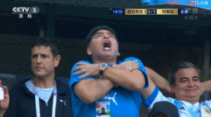 梅西进球后,看台上的阿根廷传奇马拉多纳激动地仰头望向天空,口中念念有词。