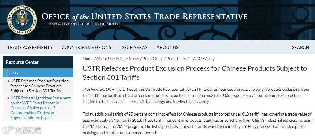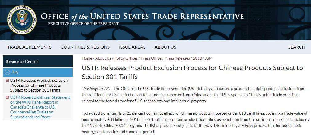 美国贸易代表处在网站上发表了官方声明,公布了企业申请关税豁免的流程: