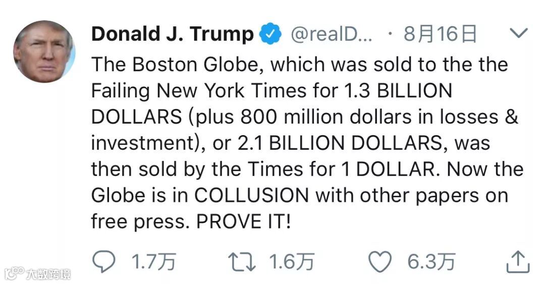 《波士顿环球报》曾以13亿美金(加上8亿美金的亏损和投资),或者说是21亿美金,卖给了同样失败的《纽约时报》,然后又被《纽约时报》1美元卖了。现在《波士顿环球报》“勾结”其他媒体针对媒体自由怼我,证明给我看啊!