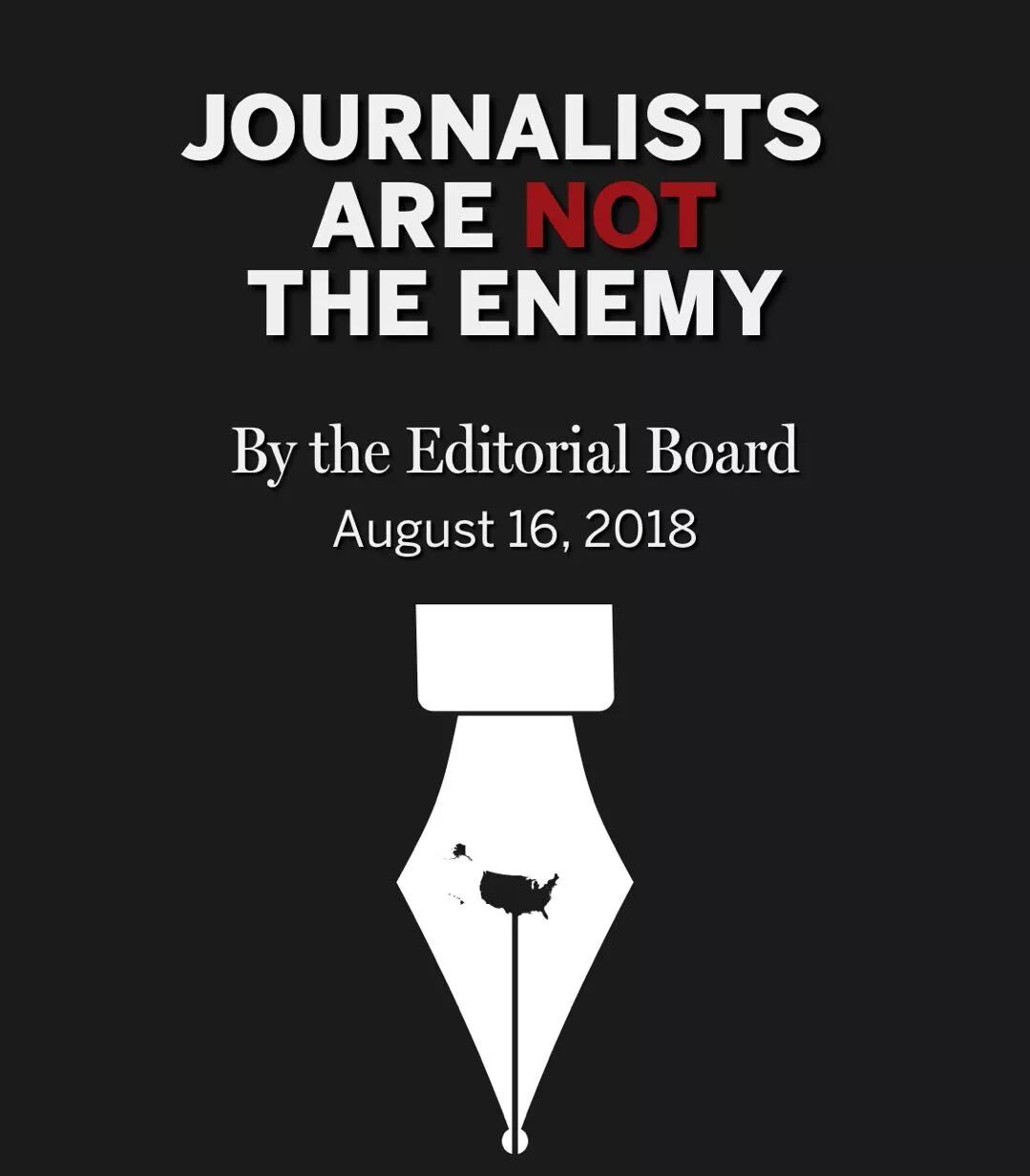 《波士顿环球报》在网站头条位置用黑底白字打出标题:“记者不是敌人”(journalists are not the enemy),并滚动展示几百家媒体的社论引文。