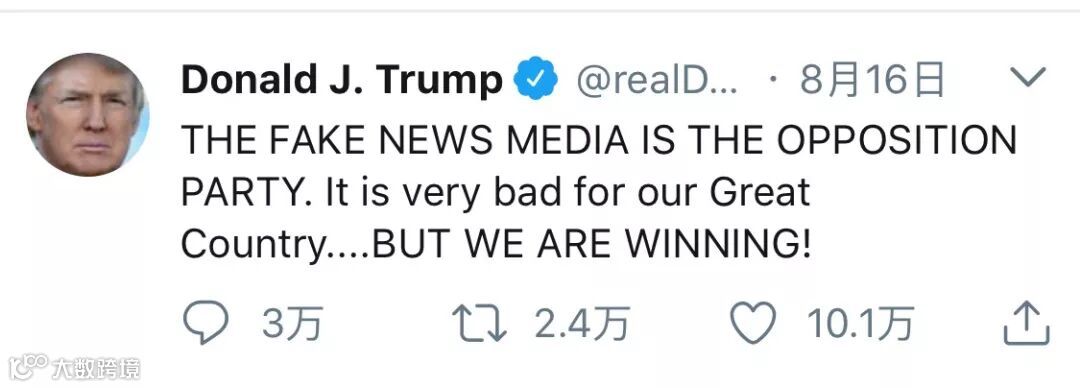 发布假新闻的媒体都是反对党,对我们伟大的国家非常有害......但我们胜券在握!