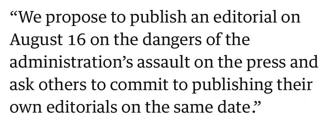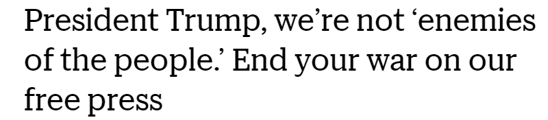 在如今的美国,对媒体最猛烈的一些攻击来自政府官员……对我们的工作而言,纠正政府的错误是核心工作。但是某些人坚持把不喜欢听到的真相称为“假新闻”,这会危及国家民主命脉。