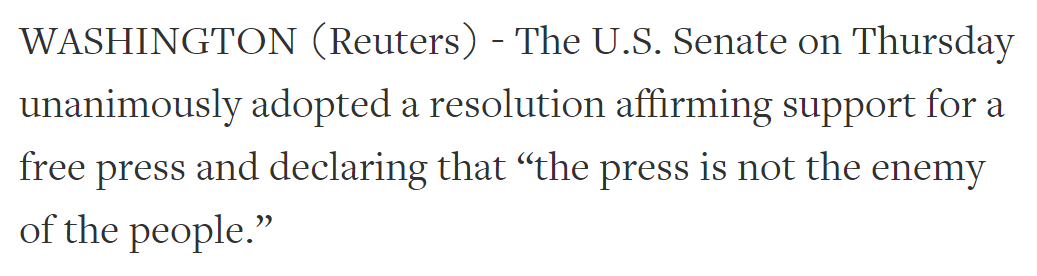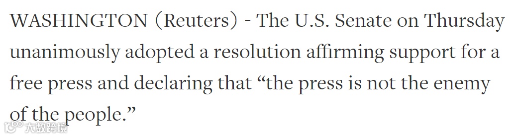 据路透社报道,16日,美国国会参议院通过决议,重申对新闻自由的支持,确认“媒体不是人民公敌”。