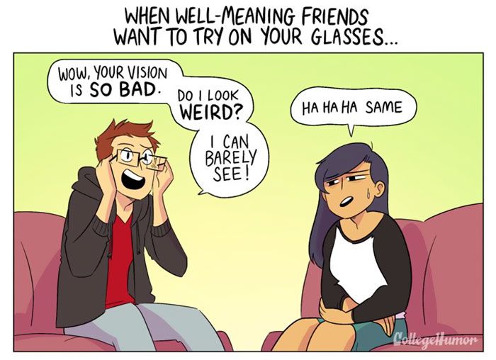 美国艺术家卡里纳·费克创造了一组短漫画,生动揭示了眼镜侠们的烦恼。