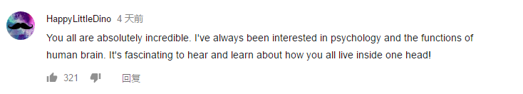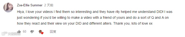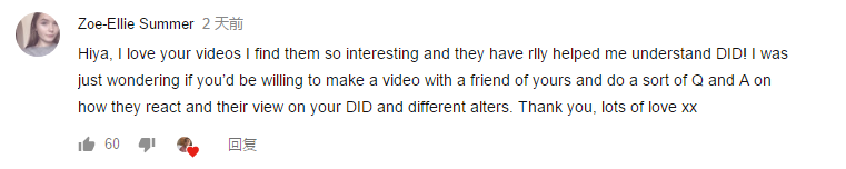我爱你的视频!我觉得视频内容很有趣,也真正帮助我了解了DID!我只是在想,你是否愿意跟你的朋友拍摄一个视频,做一些问答,关于他们对你的DID和不同人格是如何反应及如何看待的。谢谢你,爱你!
