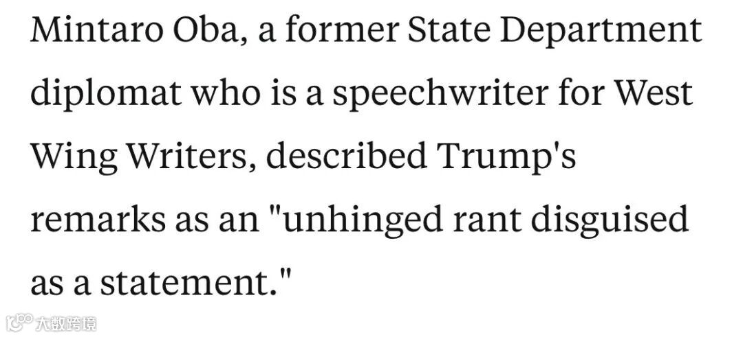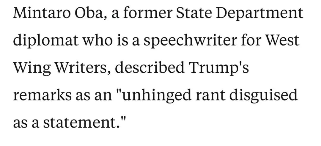 美国前外交官奥巴(Mintaro Oba)更愿意把特朗普的言论描述为“伪装成声明的疯狂咆哮”。